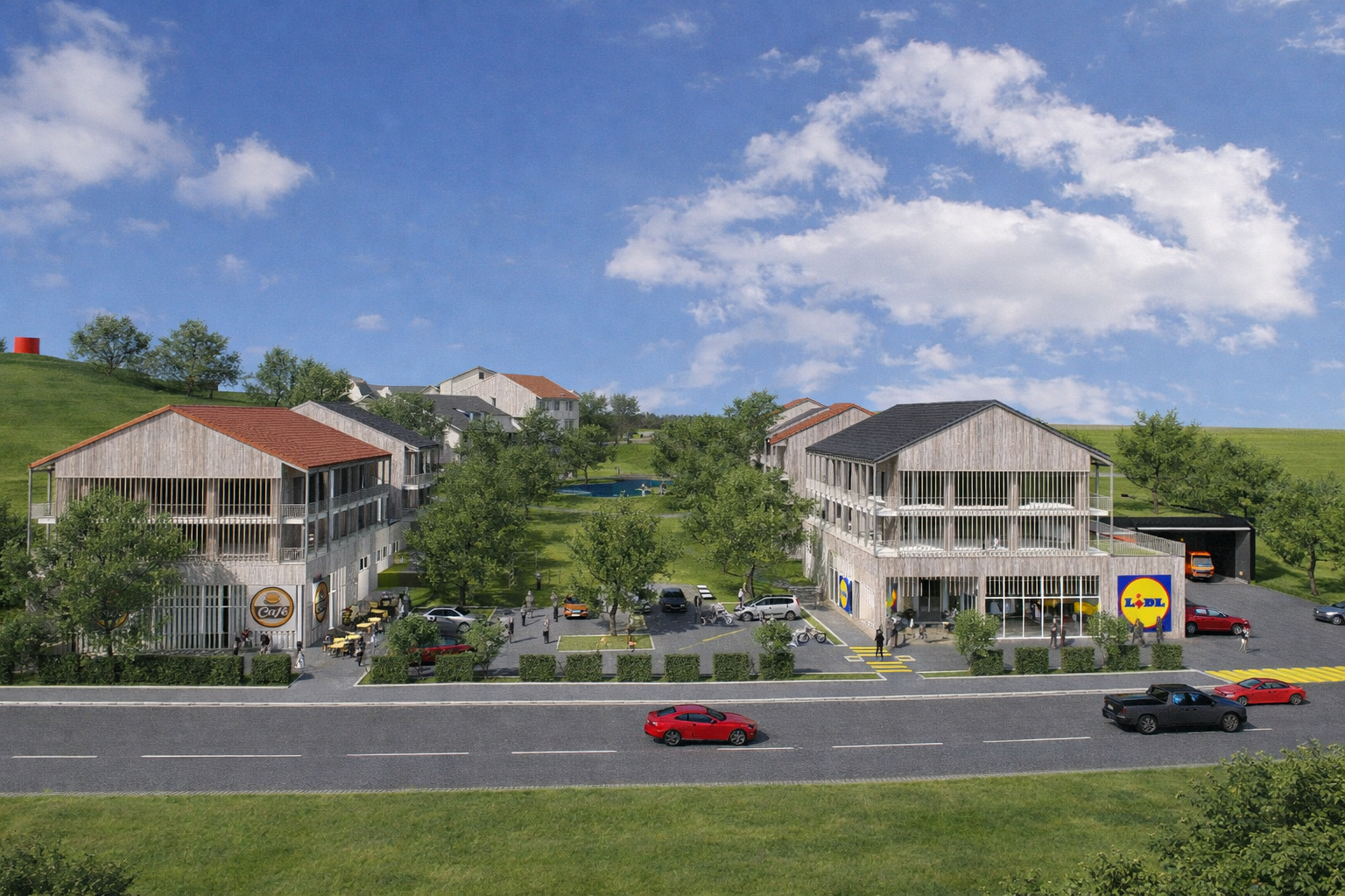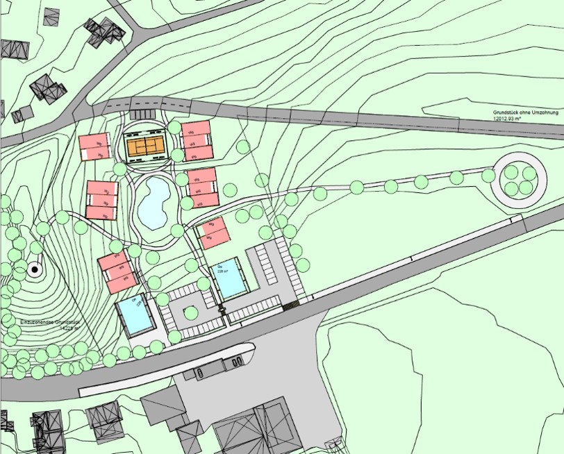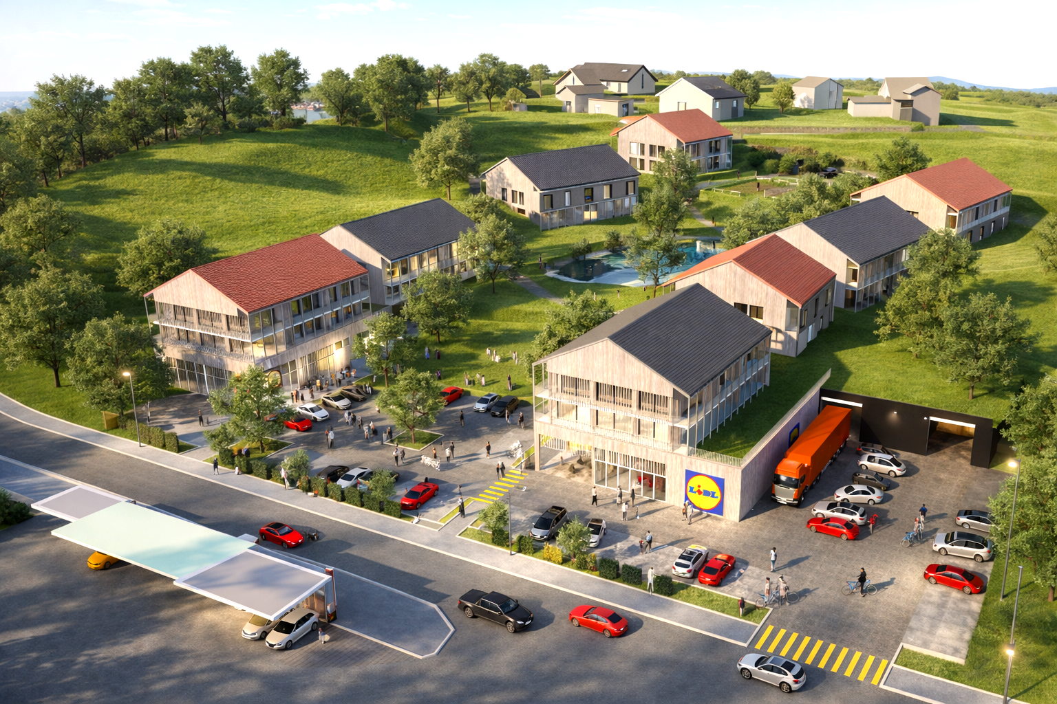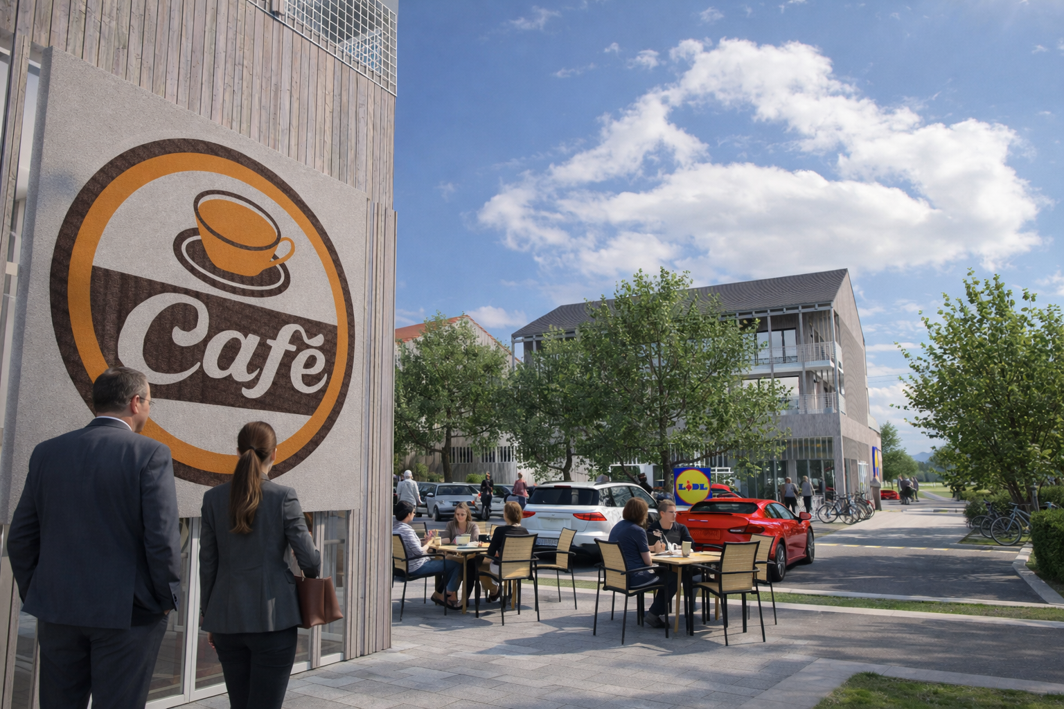 | Ansicht vom Café Richtung LIDL | Erdgeschoss mit Tiefgarage | Obergeschoss im Park |